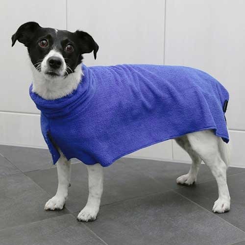 Door het absorberende vermogen droogt de hond sneller en voorkomt het dat de hond snel afkoelt. De badjas is gemakkelijk over het hoofd aan te brengen en met een stelkoord aan te sluiten bij de nek, voor extra warmte.