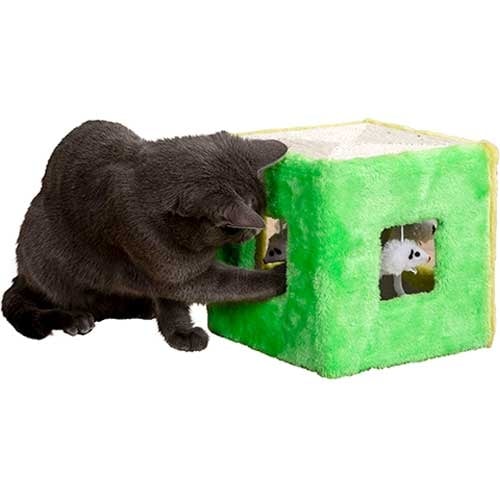 Deze grote speelkubus is bekleed met pluche en sisal en heeft 4 openingen met leuke speelmuisjes. voor uren speelplezier.