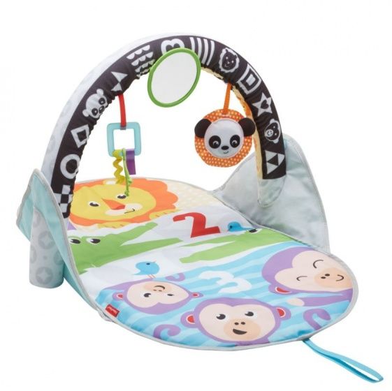 Fisher-Price babygym Van op de rug spelen tot op de buik spelen, de Fisher-Price babygym is een leuk vermaak voor kleine onderzoekertjes in de groei. De zachte speelmat kan in de wasmachine, heeft felle kleuren en zit vol met leuke dierenvriendjes waarmee je baby heerlijk op de rug kan spelen.