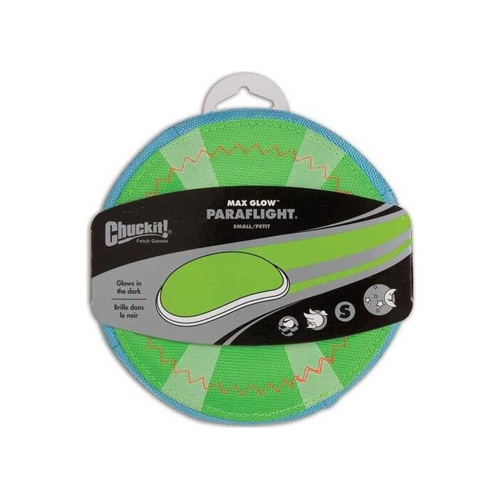 De Chuckit Paraflight max glow is een glow in the dark frisbee en super leuk voor de actieve honden. Houdt de frisbee 5-10 in een fel licht en hij schijnt tot wel 30 minuten lang in het donker.