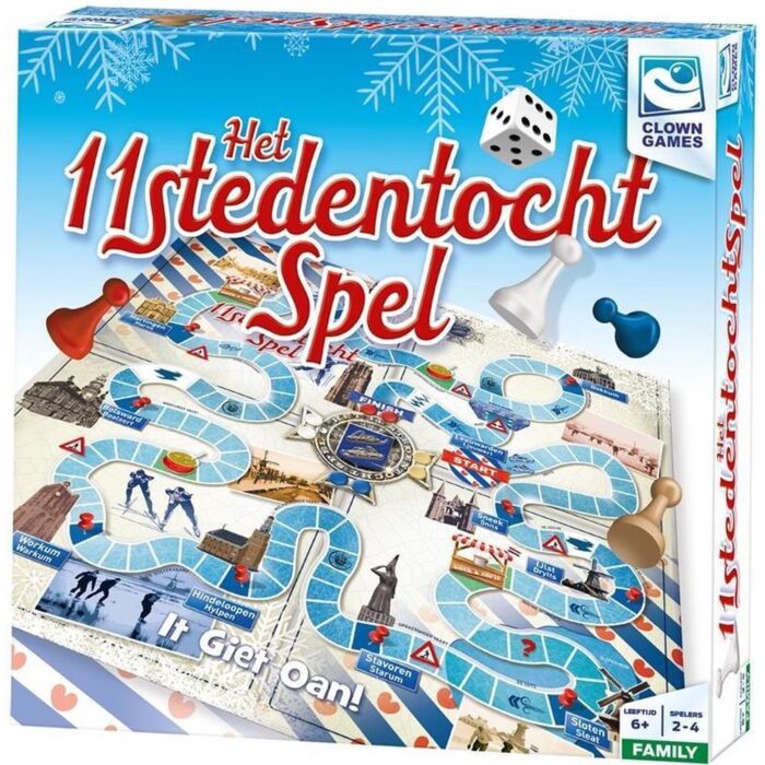 Hét 11-Stedentochtspel. Wie is als eerste bij de finish en wint het felbegeerde elfstedenkruisje? Gooi met de dobbelsteen en verplaats de pion met het aantal ogen dat is gegooid. Wanneer je op één van de vakjes komt met een plaatje, voer dan de opdracht uit die bij het plaatje hoort. Als je bijvoorbeeld moet klúnen, sla je een beurt over. Of heb jij de wind in de rug en telt je worp dubbel? De speler die als eerste over de finish komt, wint de Elfstedentocht. Inhoud: 1 spelbord van 50 x 50 cm, 8 houten pionnen in vier kleuren, 1 dobbelsteen en handleiding met spelregels. Voor 2-4 spelers of teams vanaf 6 jaar.