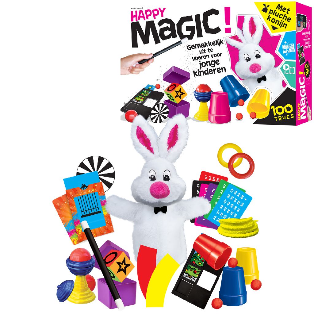 Happy Magic goocheldoos met pluche konijn. Een selectie van 100 goocheltrucs, speciaal gemaakt voor jonge goochelaars. De zeer gemakkelijk te leren trucs worden ondersteund door een instructieboek en online video instructies. Met deze set zal je vele uren van plezier en vermaak hebben! Wordt geleverd in full-colour doos. Geschikt voor kinderen vanaf 7 jaar.