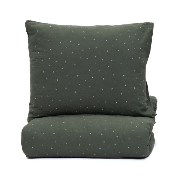 Het beddengoed is gemaakt van mousseline met katoenvezels, die luchtdoorlatend zijn en de huid vrij laten ademen. De kussenslopen voelen uitzonderlijk zacht en aangenaam aan, zijn duurzaam en gemakkelijk te onderhouden. Het gewicht van het beddengoed is 145 g/m², wat ervoor zorgt dat het licht is en het een uitstekende keuze maakt voor warmere nachten, hoewel je het met een gerust hart het hele jaar door kunt gebruiken.