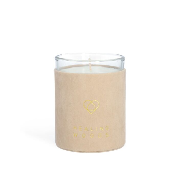 De ETERNAL geurkaars Healing Woods is gemaakt van witte paraffine en wordt geplaatst in een transparant glas met een hoesje gemaakt van een materiaal dat lijkt op beige suède. De kaars weegt 230 gram en heeft afmetingen van 8x9cm. De brandtijd van deze kaars is 48 uur.