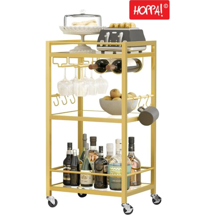 Hoppa! Songmics Serveerwagen, Barwagen, Magnetronwagen, Drankwagen, Mobiele keukenplank met wijnrek en glazen houder, Goud