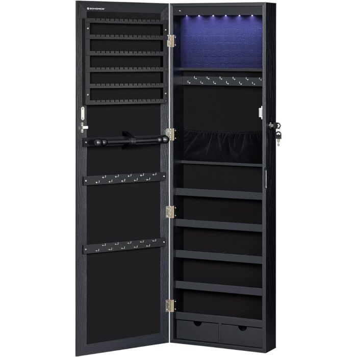 6 LED's spiegel sieradenkast, 47,2-inch hoge afsluitbare wand- of deurgemonteerde sieradenkastorganizer met spiegel, 2 laden, zwart