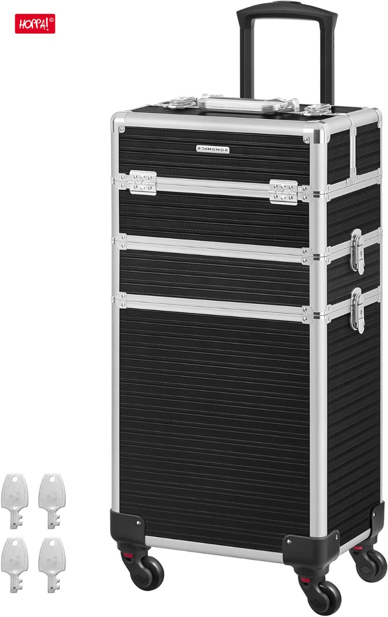 Cosmetic Case Trolley, professionele make-up case, kapperskoffer met 4 uitneembare universele wielen, make-up case, top met 3 uittrekbare compartimenten, laden, voor op reis, zwart