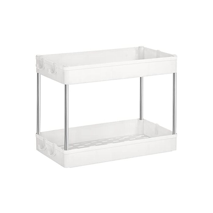 Vergroot uw ruimte onder de wastafel: Benut de ruimte onder uw gootsteen optimaal met dit aanrechtblad van 40 x 22 x 31 cm; de 2 legplanken bieden voldoende ruimte om schoonmaakproducten, shampoos en sprayflacons op een georganiseerde manier op te bergen Stevig gebouwd: De roestvrijstalen buizen vormen samen een stevige structuur en houden de planken van PP-kunststof stevig op hun plaats. Deze keukenplank onder de gootsteen kan tot 5 kg per niveau dragen Details zijn belangrijk: dit opbergrek voor onder de gootsteen heeft 6 haken voor het ophangen van lappen, handdoeken of sponzen; de legplanken met luchtgaten zorgen voor een goede ventilatie Montage is een eitje: met slechts 4 gelabelde onderdelen, geen gereedschap nodig - deze badkamerplank onder de wastafel kan in 4 eenvoudige stappen worden gemonteerd en kan het beste maken van een beperkte ruimte Een meubelstuk, vele toepassingen: Het kan niet alleen worden gebruikt als een kleine plank onder de gootsteen, maar ook als opslag bovenop de tafel, in de voorraadkast of voor het opbergen van make-up