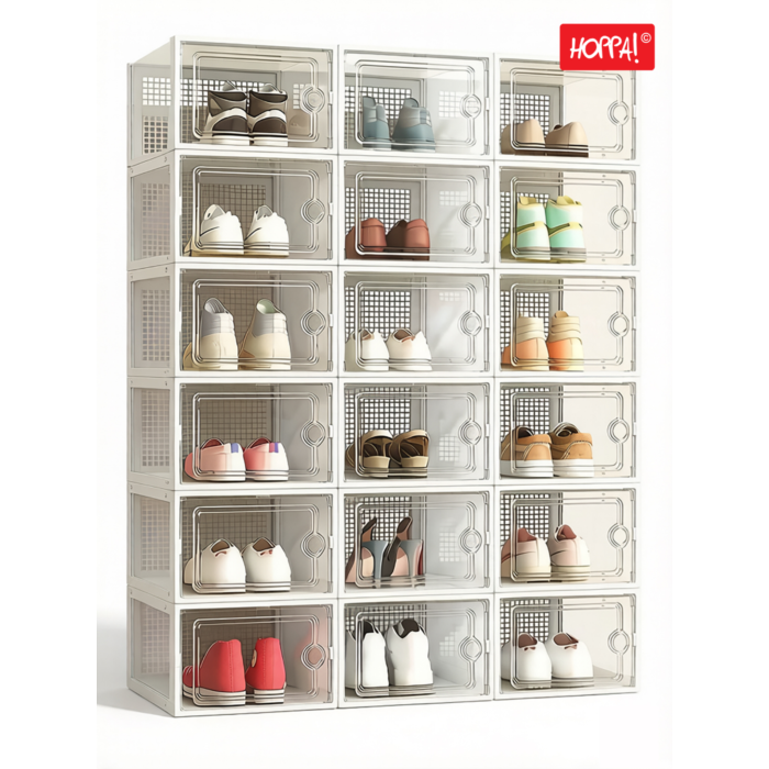 CHAOS, WEGWEZEN! Zakt je huis regelmatig weg in een schoen-chaos? Dan komen deze 18 schoendozen, die een transparant lichaam en een transparante deur hebben, goed van pas, Breng orde in uw schoenencollectie!
