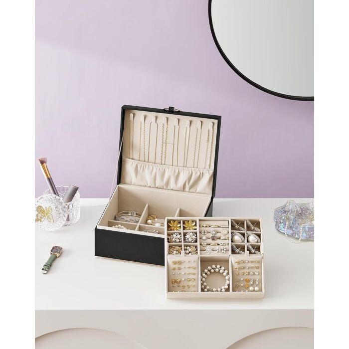 U plaatst een review over: Sieradendoos, 2-laags sieradendoosje, sieradenorganizer met handvat, afneembaar sieradenrek, zwevend effect, 20,5 x 24 x 11 cm, cadeau-idee zwart