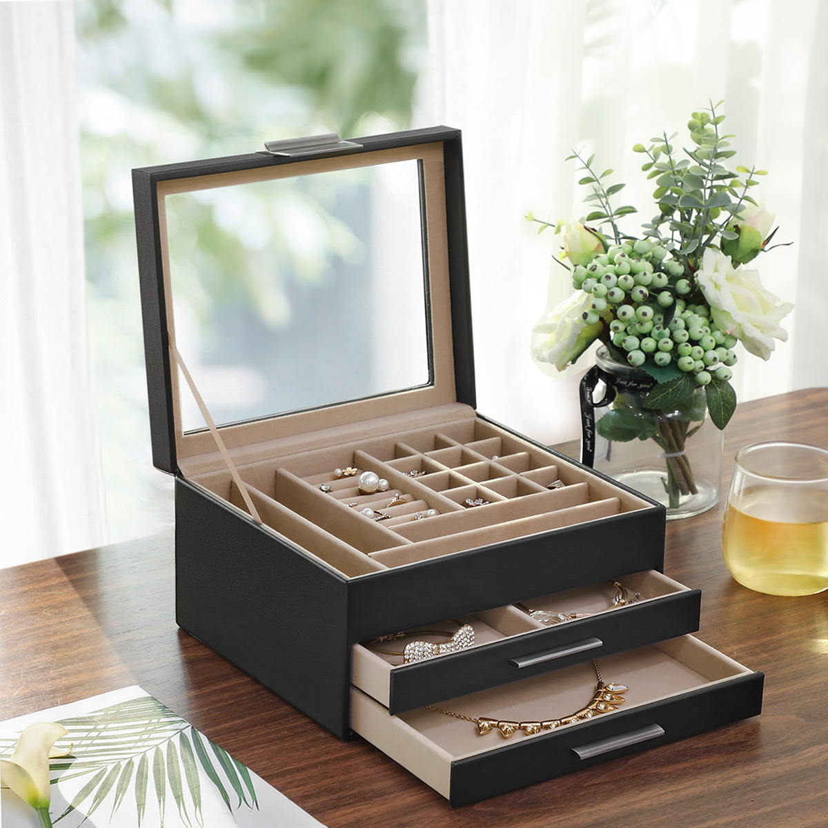 U plaatst een review over: Sieradendoos, Sieradendoos met glazen deksel, Sieradendoos met 3 niveaus, Sieradendoos met 2 laden, Opbergdoos voor sieraden, Cadeau voor uw dierbaren, Zwart