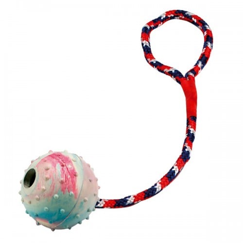 Dit rubber speeltje met kleurig en stevig werptouw en stimulerend belletje is een uitkomst voor honden die lekker willen rennen. Het werptouw maakt dat u het eind kan weggooien zonder dat u teveel kracht moet gebruiken.