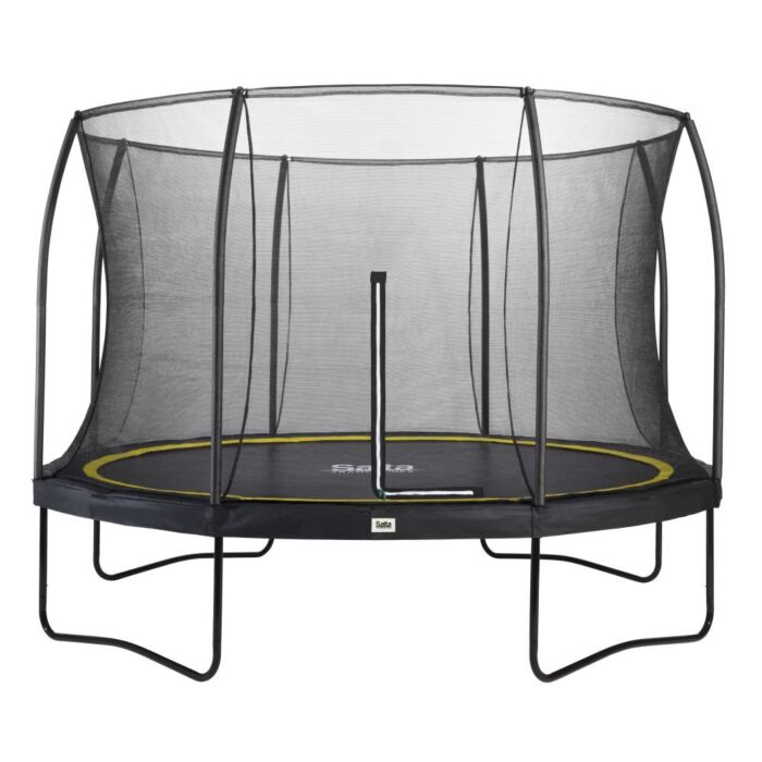 De Salta Trampoline Rond Comfort Edition - 427x427cm Antraciet biedt comfortabel springplezier voor beginners. Het stalen frame is gegalvaniseerd en voorzien van een zwart glanzende coating voor een veilige basis. Het fijnmazige veiligheidsnet zorgt voor optimale bescherming tijdens het springen, terwijl de stalen topring het net in een elegante vorm houdt. De trampoline heeft een stijlvol design met een zwarte veiligheidsrand.