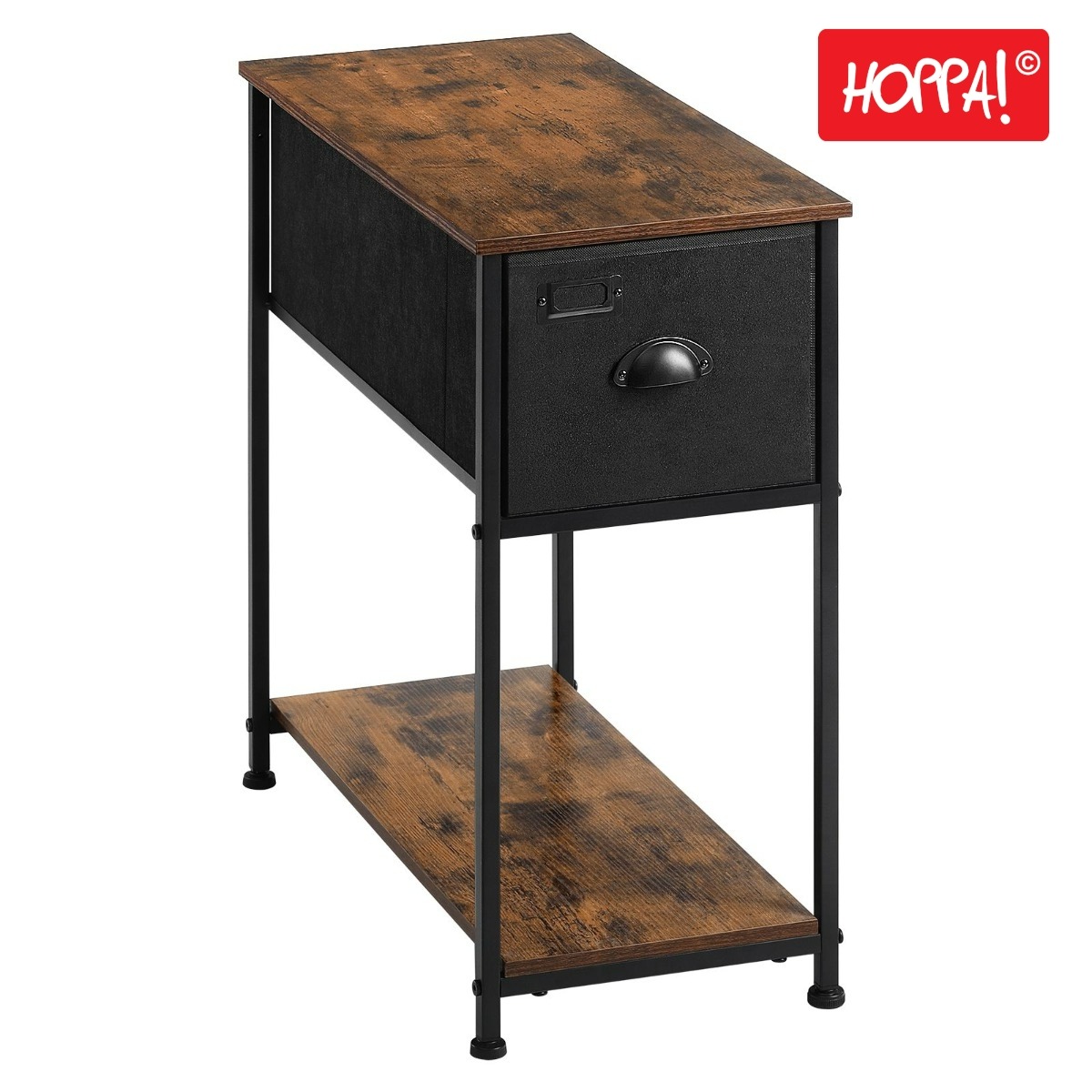 Dit industriële bijzettafeltje met stoffen lade en ruime legplank is de perfecte toevoeging voor je woonkamer.Plaats het meubel naast je bank om boeken, je laptop, een drankje... dichtbij te houden.