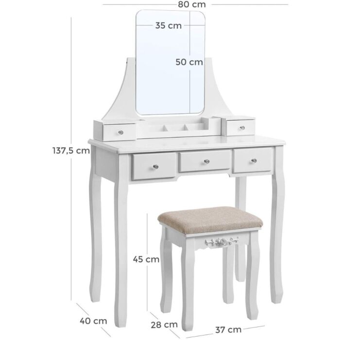 Duurzaam: de make-uptafel is gemaakt van MDF-platen en de tafelpoten zijn gemaakt van grenenhout, wat een goede stabiliteit garandeert. De krukpoten van rubberhout zijn ook sterk, zodat de stoel jarenlang blijft zitten (tot 130 kg belastbaar).