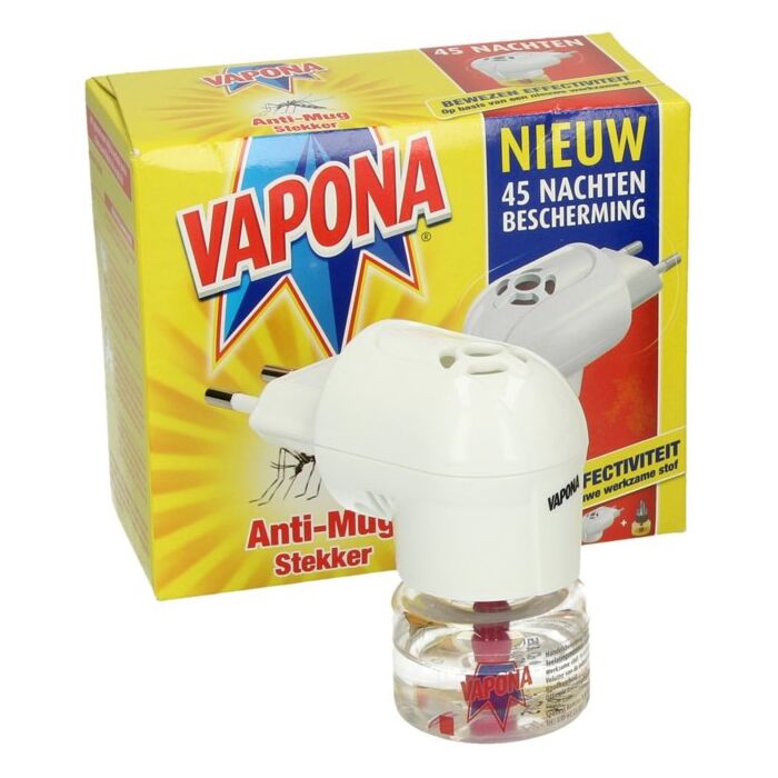 Vapona Anti Mug stekker is ontwikkeld met een werkzame stof. Dankzij deze formulering kunt u genieten van uw nachtrust zonder overlast van deze vervelende insecten. Met Vapona Anti Mug bent u beschermt gedurende 45 nachten. Voordelen: ﻗ± Genieten van uw nachtrust zonder verstoord te worden door muggen of overige insecten ﻗ± Bewezen effectiviteit op basis van een nieuwe werkzame stof ﻗ± Langdurige werking: 45 nachten ﻗ± Bevat een nieuwe generatie werkzame stof Gebruiksaanwijzing: 1)Lees voor gebruik eerst het etiket. Controleer vooraf of het voltage juist is (230V). 2)Draai de dop van het flesje los en plaats het zodanig in het apparaat dat de lont zich boven in het cilindrische gedeelte van de verdamper bevindt. Navulling mag alleen gebruikt worden met de aanbevolen verdamper. 3)De verdamper zodanig in het stopcontact plaatsen dat het apparaat steeds in verticale positie staat. De stekker heeft twee posities zodat hij geschikt is voor zowel verticaal als horizontaal georiﺃﺙnteerde stopcontacten. 4)Voor een effectief gebruik wordt aanbevolen de stekker 2 uur voor het slapengaan aan te zetten. Haal de stekker overdag uit het stopcontact, en steek hem ﻗ°ﻷs avonds weer in. De Anti-Mug stekker werkt gedurende 45 dagen op basis van 8 uur gebruik gedurende de nacht of 360 uren. De stekker is geschikt voor ruimtes tot 30 m3. De stekker is niet geschikt voor tochtige ruimtes. Inhoud: 1x Vapona Plug-in stekker